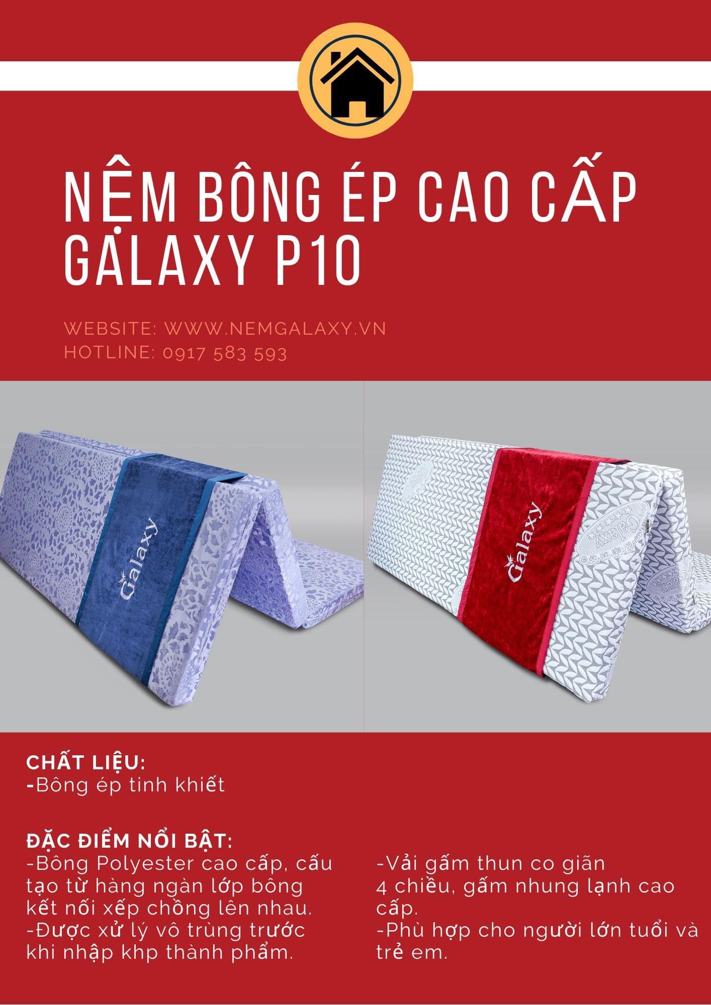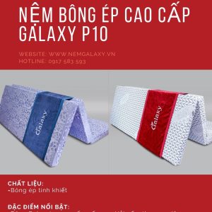 Tiên phong mang đến giải pháp chăm sóc giấc ngủ thông minh cho không gian sống hiện đại, nệm bông ép Galaxy P10 là sự kết hợp hoàn hảo giữa công nghệ Hàn Quốc tiên tiến và tính ứng dụng cao. Không chỉ làm tốt nhiệm vụ nâng niu giấc ngủ, Galaxy P10 còn là mảnh ghép nội thất linh hoạt, đáp ứng trọn vẹn nhu cầu của mọi thành viên trong gia đình.